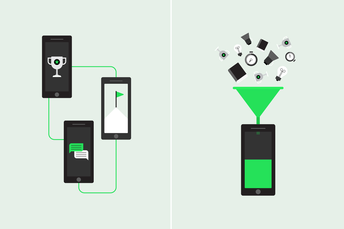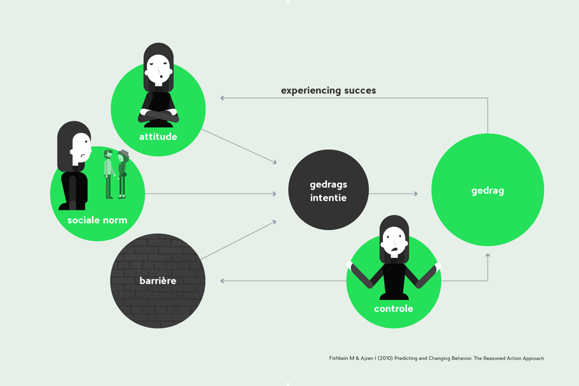 Deze gedachte is gebaseerd op uitgangspunten van verschillende gedragstheoriën. Tiny habits, Theory of planned behavior en intrinsieke motivatie. Ik heb een aantal illustraties gemaakt die dit uitleggen.